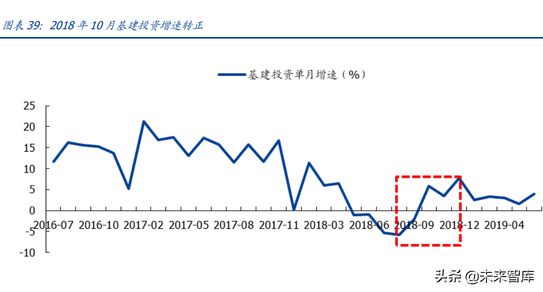 隐性负债管控,基建小幅企稳。本轮基建投资虽然是稳增长发力工具,但主要依靠地方 政府专项债的加快发行,城投平台的债务受到严格限制,制约了基建投资的回升幅度。 2018 年 7 月政策转向后,基建投资仍延续下行,在 10 月单月增速才转正,全年仅增长 1.8%。