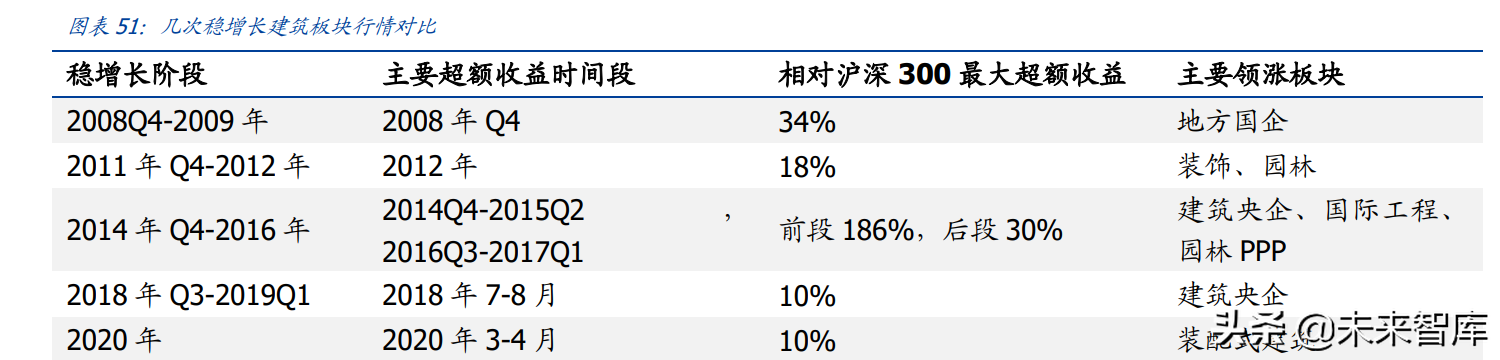 装饰园林企业涨幅居前。2011 年后民营装饰及园林企业开始陆续上市。随着基建投资的 大幅反弹以及地产销售回暖,装饰和园林企业迎来业绩高速成长期。本轮稳增长区间中 涨幅居前的主要是装饰与园林企业。在 2011 年 9 月-2013 年 6 月涨跌幅排名前十的企业中,前八位都是装饰与园林板块的公司。(报告来源:未来智库)