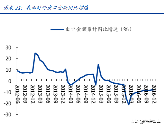 国际市场需求乏力,全球贸易出现萎缩,冲击我国外需。金融危机后全球经济复苏步履 维艰,国际市场没有大的起色,贸易保护主义有所抬头。根据 WTO 数据统计,2014 年 全球进出口金额 0.32%,较 2013 年增速下降 1.73 个 pct,而 2015 年增速低至-12.6%, 对中国外需产生冲击。我国对外出口金额也在 2014-2016 年持续走低。