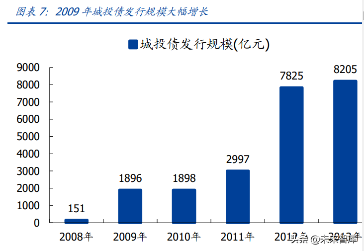 地方融资平台扩张,逐步担当基建融资主力。四万亿投资是以政府主导的基建、市政类 项目为主,在转移支付的过程中,需要地方政府配套融资,但当时地方政府不能直接发 行债券也不能向金融机构贷款,项目投资落实缺乏快速有效渠道。2009 年 3 月,央行和 银监会联合提出:“支持有条件的地方政府组建投融资平台,发行企业债、中期票据等融 资工具,拓宽中央政府投资项目的配套资金融资渠道。”地方融资平台开始井喷式出现, 基建贷款迅速落实,城投债发行规模明显增长,2009 年全年发行规模 1896 亿元,超过 历史之和,地方政府运用融资平台支持基建成为重要力量。