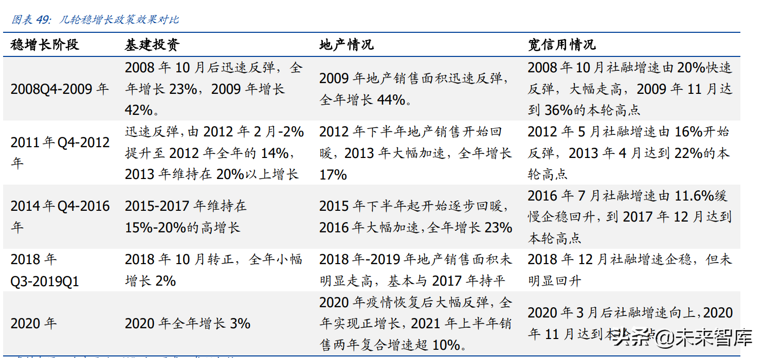 2008 年以来,我国共经历了五次“稳增长”,按时间大致可以划分为:2008 年 Q3-2009 年,2011 年 Q4-2012 年,2014 年 Q4-2016 年,2018 年 Q3-2019 年 Q1,2020 年五个 阶段。前三次“稳增长”政策力度较大,稳增长效果明显,基建投资大幅反弹或维持高 位,地产销售明显回暖,社融增速明显回升。后两次主要是应对中美贸易摩擦与新冠病 毒疫情所采取的阶段性对冲,政策力度相对较温和,基建回升幅度较小,地产调控政策 保持严格。