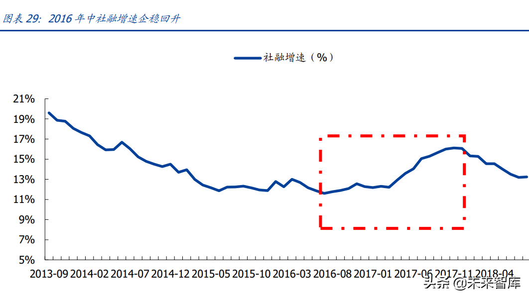 地产销售大幅回升支持宽信用,2016 年中社融增速企稳上行。本轮“稳增长”政策发 力见效较慢,自 2014 年 9 月地产调控转向后,经历 2015 年连续降息降准,一直到 2016 年棚改货币化安置放量,地产销售增速大幅向上后社融才企稳回升。此外叠加 2016 年 PPP 落地加速,城投发债增加,信用扩张进一步加速,至 2017 年 11 月达到本轮社融增 速的高点。