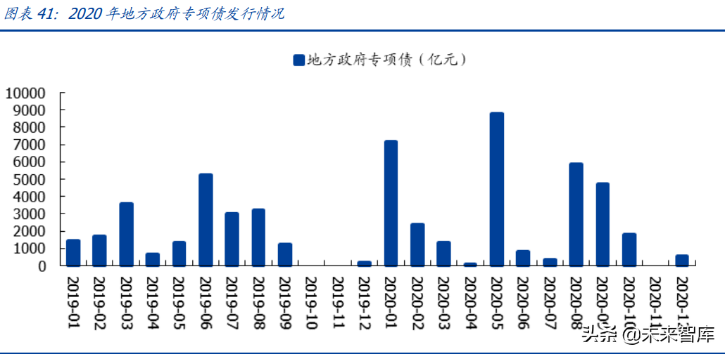 财政政策方面,加大专项债发行力度,增加发行特别国债。4 月的中央政治局会议明确 “以更大的宏观政策力度对冲疫情影响,积极的财政政策更加积极有为”,并指出要“发 行抗疫特别国债”和“增加地方政府专项债额度”,5 月的两会宣布提高财政赤字规模 1 万亿元,专项债额度较前期增加 1.6 万亿至 3.75 万亿元,并确定特别国债规模 1 万亿元。 5 月单月地方政府专项债新发规模达到近万亿的历史高点, 6-7 月发行 1 万亿元的抗疫 特别国债,稳增长政策持续发力。