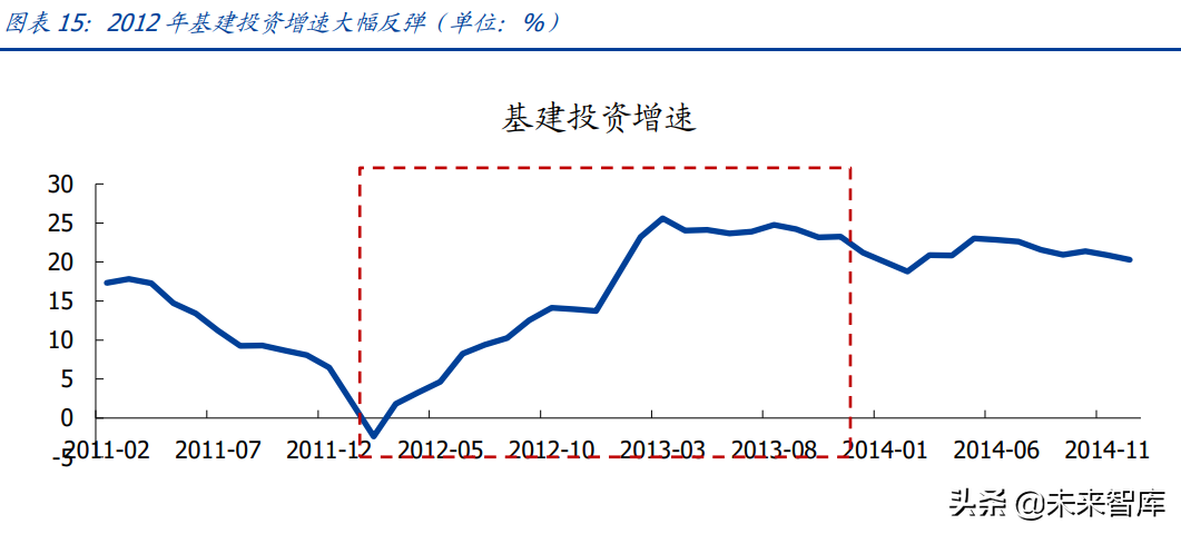 2012 年基建投资是稳增长的主要抓手,发改委加快核准重大项目,同时政策再次放松对 地方融资平台融资限制,政策再次立竿见影,基建投资从 2012 年 2 月的-2%增长迅速反弹走高,2012 年全年增长 14%,2013 年增长超 20%。