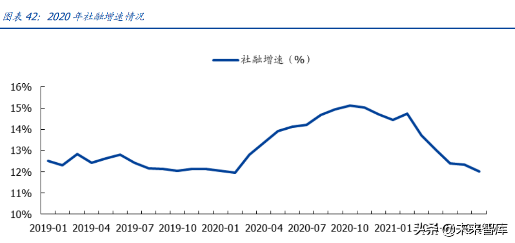 政策对冲疫情带动宽信用,社融增速走高。由于宏观政策力度显著加大,2020 年疫情爆 发后,一季度社融在巨量的政府债券发行及贷款支持带动下迅速走高,随后二季度疫情 得到控制,各项稳增长政策发力,经济实现 V 型反弹,社融延续向上,直到 2020 年 10 月达到本轮“稳增长”增速高点。