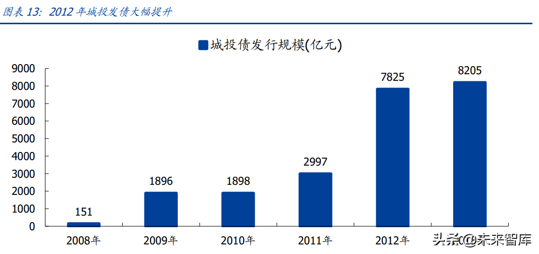 融资平台监管放松,城投债发行放量。2012 年 3 月,银监会召开《地方政府融资平台贷 款风险监管工作会议》,仍然强调监管的核心是“降旧控新”,但随着经济下行压力的加 大,对融资平台的监管也逐步放松,2012 年 7 月,银监会要求商 业银行:1)增加对“资质较好”的地方融资平台的贷款;2)增加对包括铁路在内的基 建项目贷款;3)加大对保障房的信贷支持。随着融资平台监管的放松,城投债发行 2012 年大幅增长至 7825 亿元,较 2011 年增长 161%,有力支撑了基建项目落地。