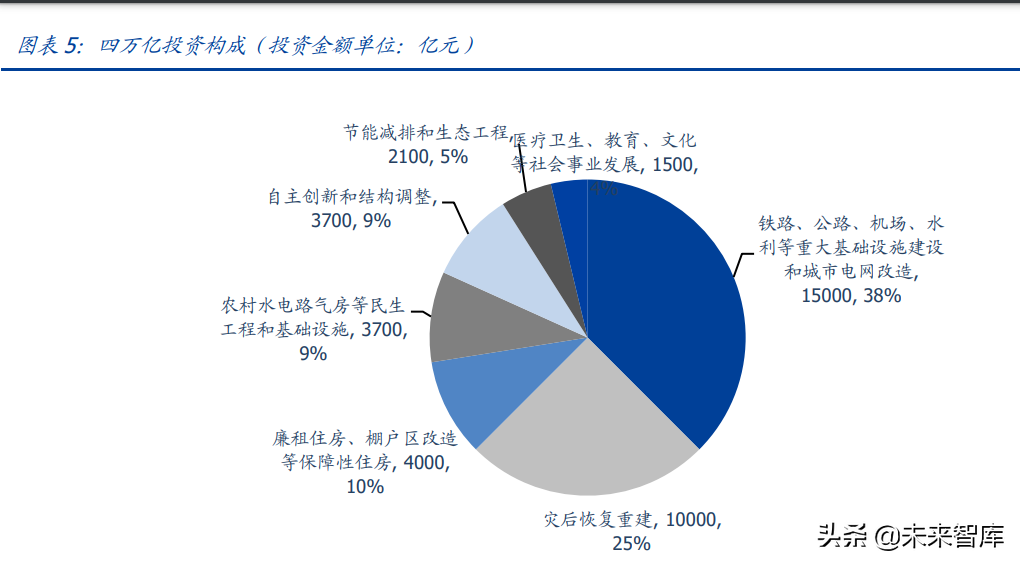 2)基建投资: 基建投资“4 万亿”出台,地方政府加码投资全力稳增长。为了应对金融危机,中国政 府于 2008 年 11 月初国常会提出进一步扩大内需、促进经济平稳较快增长的十项措施。 初步匡算,实施这十大措施,到 2010 年底约需投资 4 万亿元。其中铁路、公路等交通 设施与城市电网改造合计投资 1.5 万亿,汶川灾后重建 1 万亿,农村基建 0.37 万亿,安 居工程 0.4 万亿,节能减排环保工程 0.21 万亿,医疗教育文化等投资 0.15 万亿。地方 政府开始全力稳增长,加码基建、市政民生类投资。2008 年底的中央经济工作会议明确 “必须把保持经济平稳较快发展作为 2009 年经济工作的首要任务,要着力在保增长上 下功夫”,2009 年两会进一步明确“大规模增加政府投资”,稳增长成为 2009 年的经济 发展主题。
